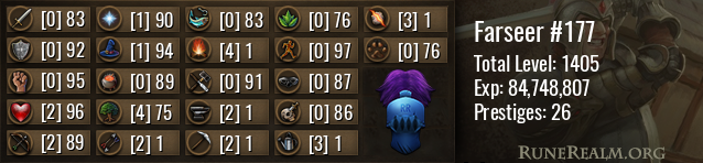 Overall Attack Defence Strength Hitpoints Ranged Prayer Magic Cooking Woodcutting Fletching Fishing Firemaking Crafting Smithing Mining Herblore Agility Thieving Slayer Farming Runecrafting Hunter